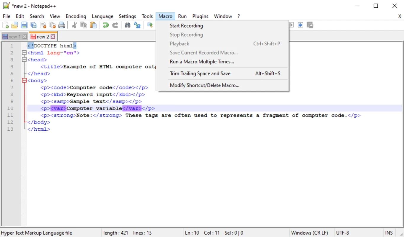 Alat ini mendukung penyorotan sintaksis untuk berbagai bahasa pemrograman agar mudah membaca dan mengatur kode. Jika Anda tidak ingin menggunakan penyorotan untuk semua teks yang dipilih, seperti yang dilakukan secara default, Anda dapat menonaktifkannya dengan membuka Pengaturan > Preferensi > Pencarian > Sorot semua kemunculan, cukup nonaktifkan opsi tersebut, dan sorot secara manual hanya bagian yang Anda inginkan. Jika teks muncul dalam satu warna setelah penyorotan sintaksis, pastikan ekstensi berkas dan bahasa yang didukung ada di menu Bahasa.
